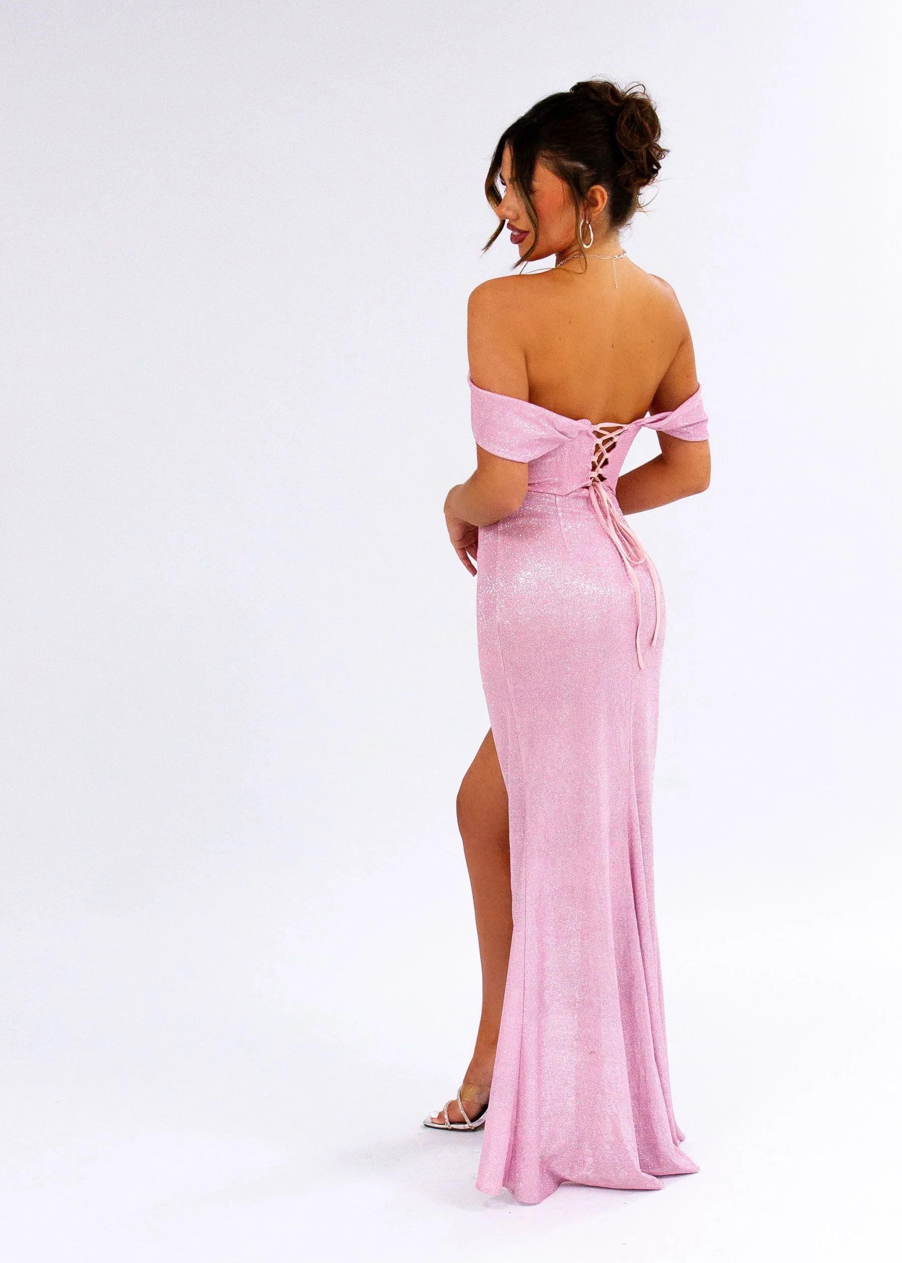 Make a bold statement in our 'Million Dollars' Pink Cowl Neck Gown! With an elegant off the shoulder design and a dramatic cowl neckline, this pink shimmer ball gown is sure to turn heads. The thigh split adds a touch of allure, making you feel like a million dollars.