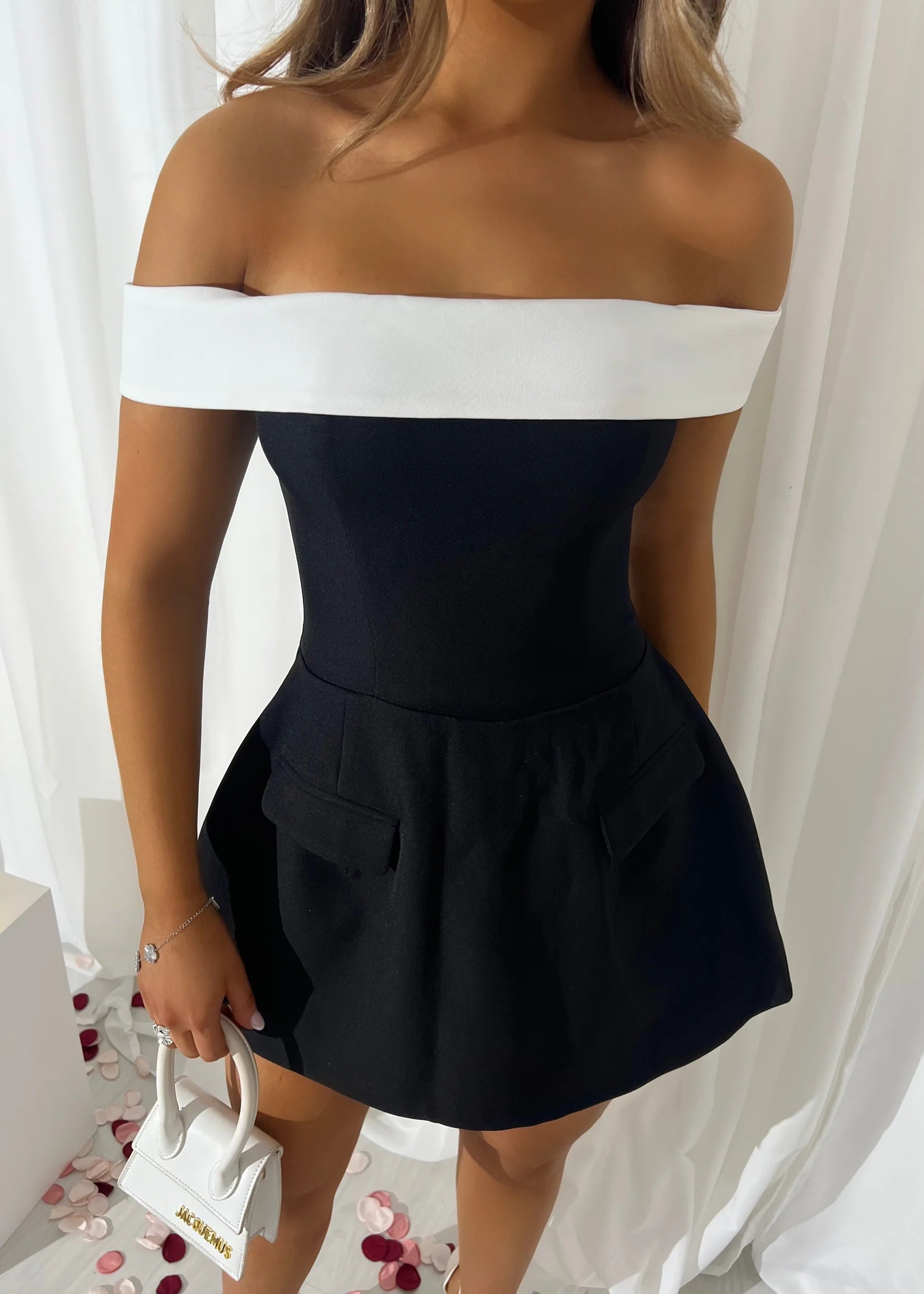 Indulge in effortless elegance with the 'Resist Me' Structured Mini Dress. This monochrome dress boasts a structured A-line silhouette for a flattering fit, while the bardot style and off the shoulder design add a touch of glamour. Perfect for any occasion, this mini dress is sure to make a statement and turn heads.
